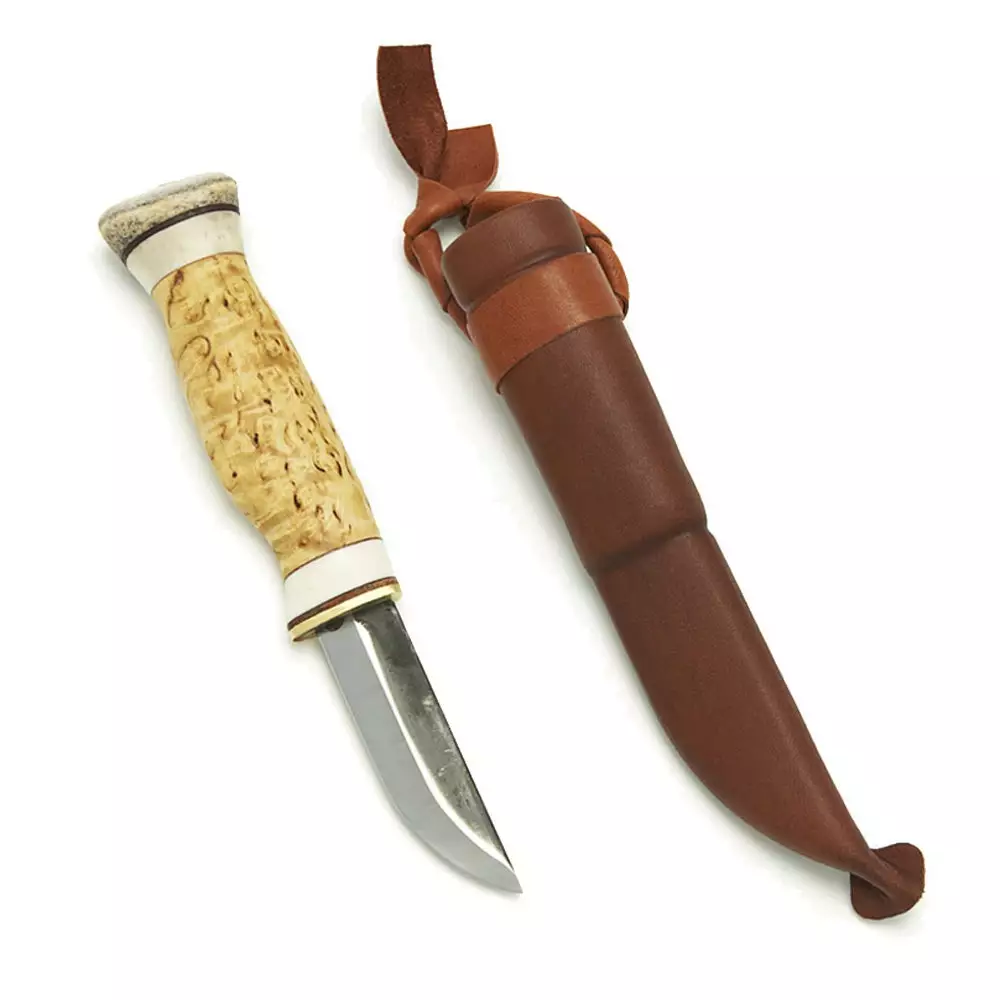 - The handle is made from a combination of curly birch, thin layers of leather and reindeer antler.