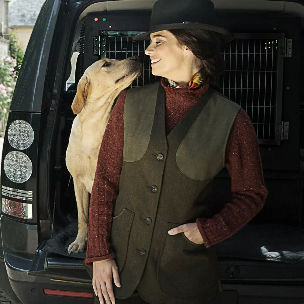 The Farlows Dartmoor Loden Shooting Vest is an elegant, practical, and stylish solution for days in the field. This women’s tweed vest is ideal on shoot days when a coat is not required, or used as a layer to wear under a fieldcoat in the colder months. Also referred to as a waistcoat or gilet, this is an essential part of your ladies’ shooting clothing and country attire wardrobe.