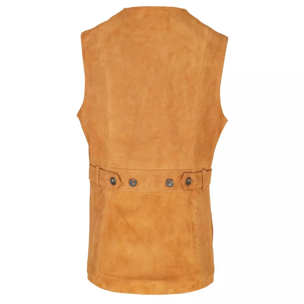 Made up in Italian suede in a lovely cognac colour, with the same material used as a shoulder patch also. Suede is a wonderful material to use for sporting clothing, specifically vests. It is incredibly hard wearing but also has the ability to breathe.