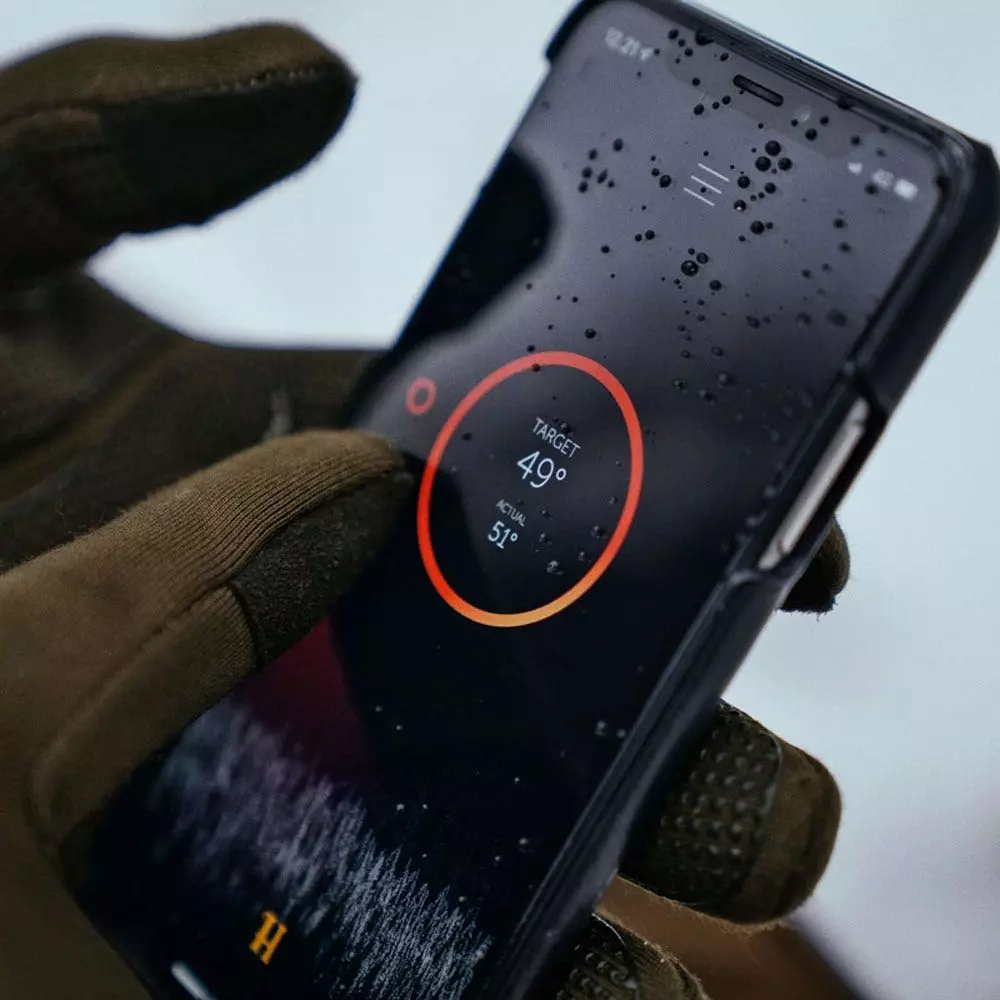 - The jacket has a large, sewn-in heating membrane on the upper back. Using a smartphone app, this membrane can be set to the desired temperature between 30C and 52C. The membrane can also be set to 38C, 46C or 52C using the push button on the right-hand side of the chest, so you are not dependent on your smartphone.