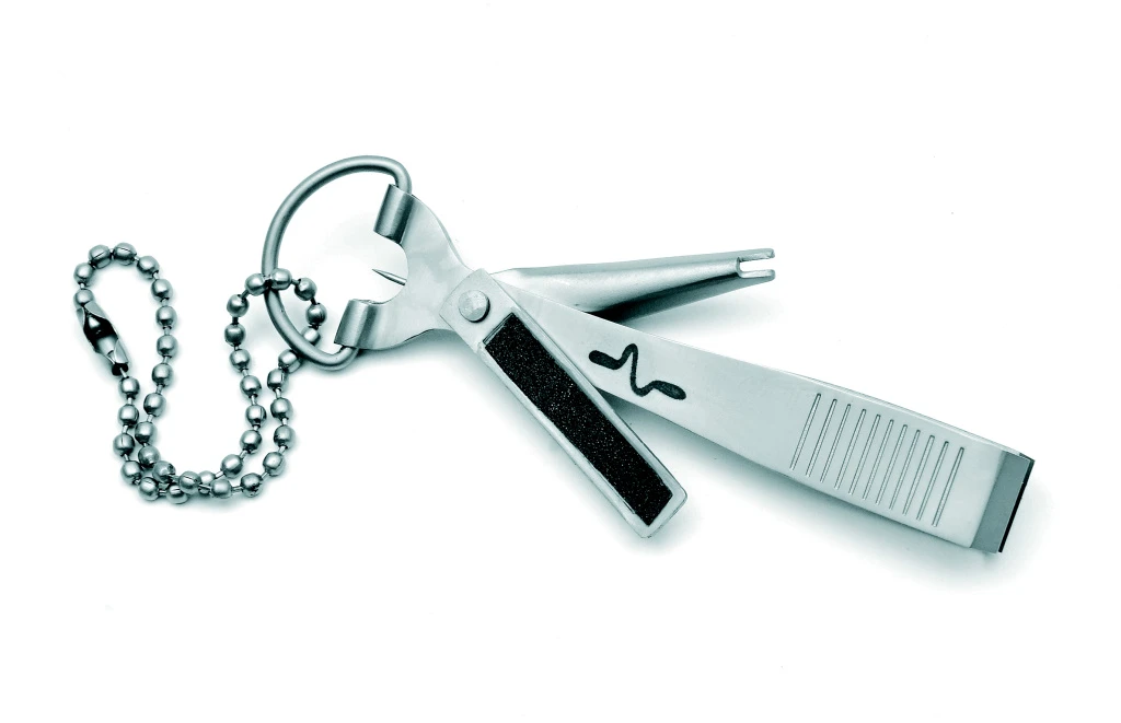 A high quality, heat-treated stainless steel tool that combines a knot tyer tip, line snips, hook eye cleaner and hook sharpener in one sturdy package. The D-ring attaches easily to a retractor. Can be sharpened.