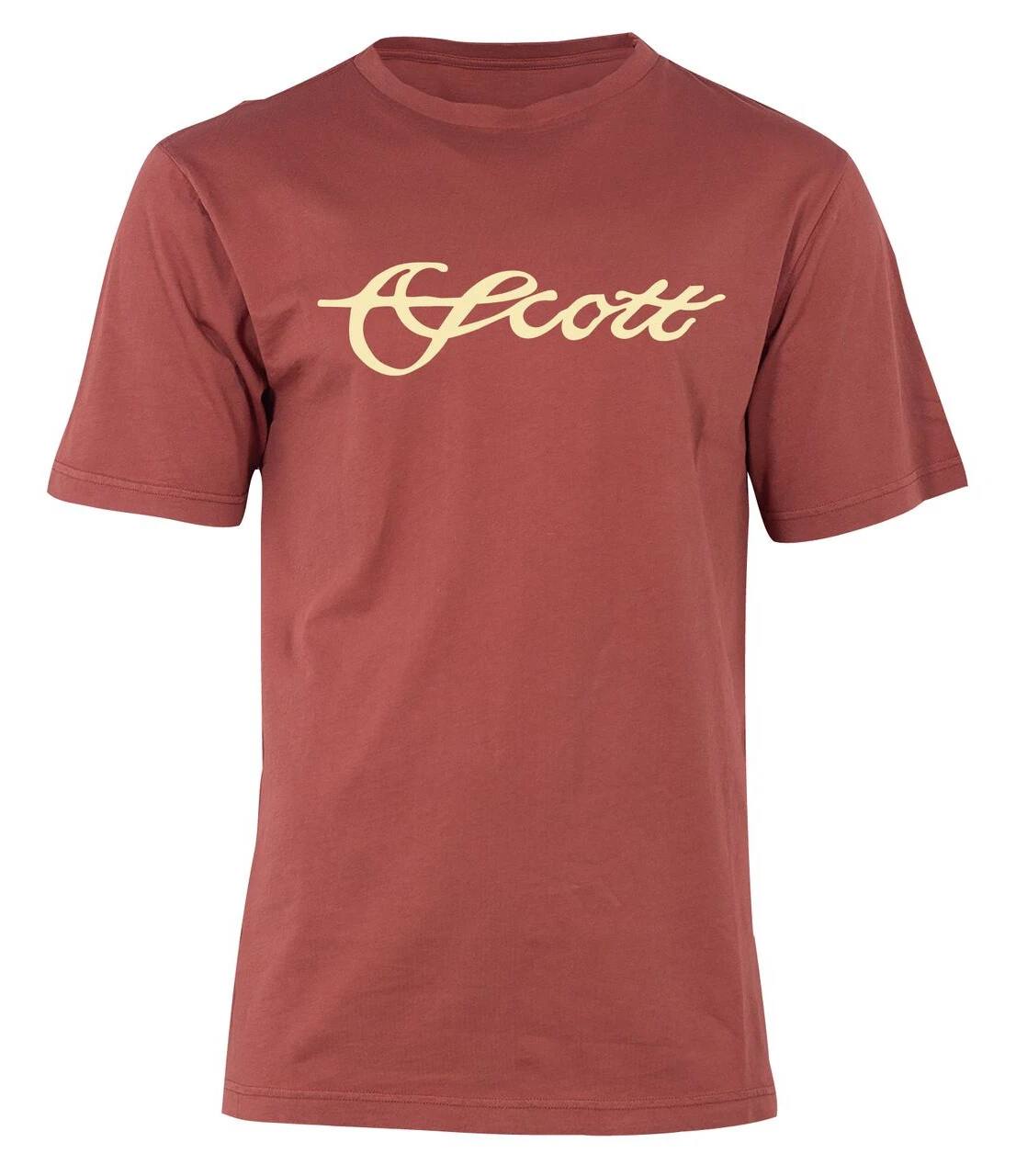 Red Brick short sleeve t-shirt with tan Scott script on the front.